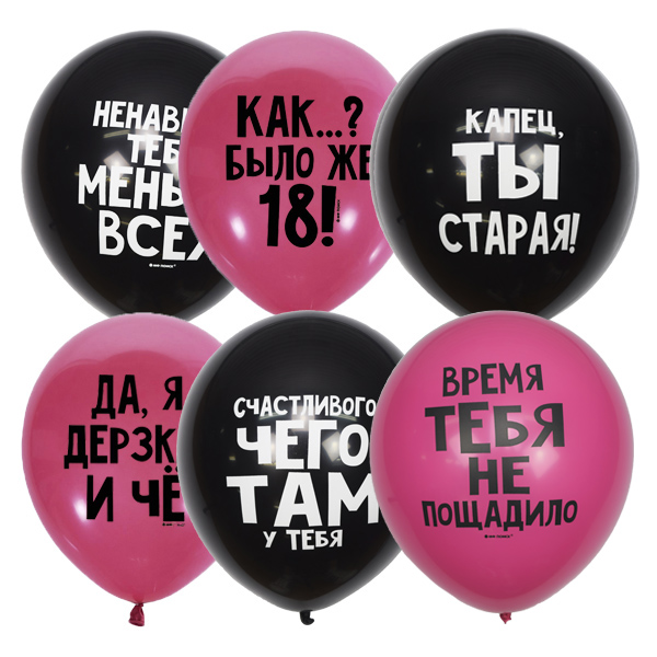 Набор включает в себя оскорбительные рисунки, которые призваны добавить юмора на празднике. Надписи на шариках сделаны в женском или нейтральном обращении