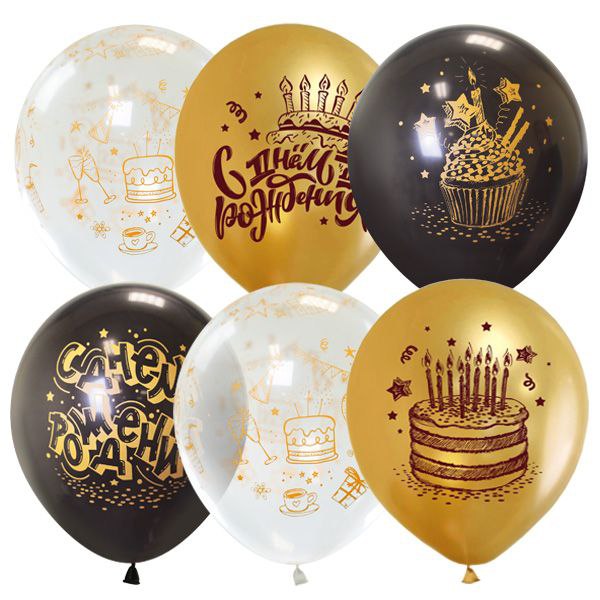 Набор включает в себя прозрачные черные и золотые шары с тематическими надписями и рисунками. Этот набор идеально подходит для поздравлений именинников